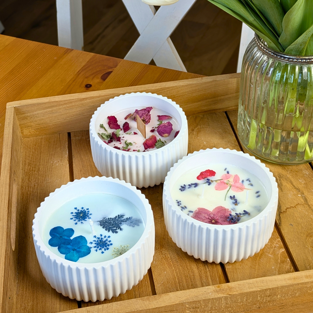 Wähle aus einer Vielzahl von hochwertigen Duftölen wie Himbeere, Mango, Rose und vielen mehr Deine Favoriten und verziere Deine Kerze mit mit echten, getrockneten Blumen, Blütenknospen oder Wachsfrüchten und verleihe ihr eine ganz persönliche Note.
